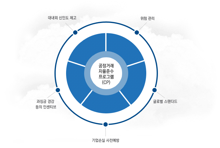 공정거래 관련 법규를 준수하기 위해서 기업 자체적으로 수립운영하는 교육 감독체계 등 내부준법 시스템을 뜻함.
